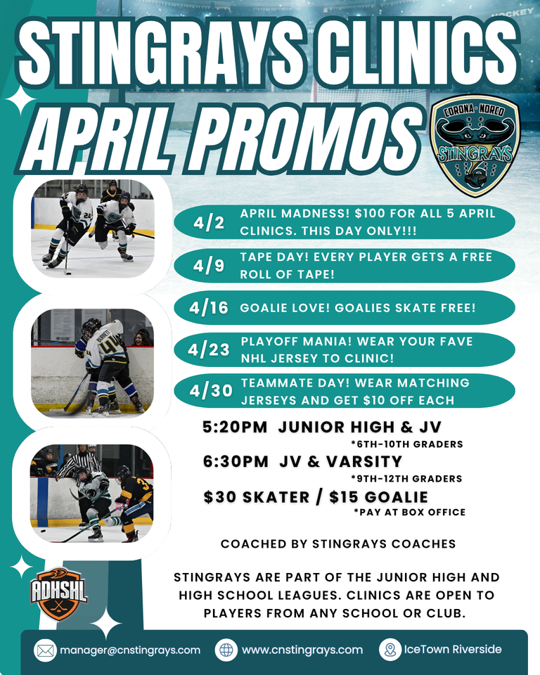 Off season clinics begin Thursday March 19th. This spring & summer we will be holding 2 different clinic options. The 5:20pm clinic is designed for players aiming to play for our Junior High or Junior Varsity team and is geared towards players entering 6th - 10th grade in the fall. Our 6:30pm clinic gives players at the Varsity level a fast paced clinic geared towards high school players only. It is possible for players on the bubble to attend both clinics. Tryout dates and times will be announced soon. You can register for our Evaluation Skates HERE. For more information please email manager@cnstingrays.com.
